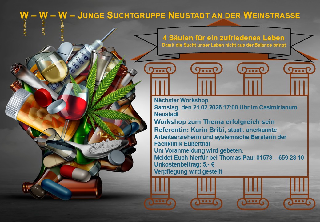 Unsere nächste Veranstaltung findet am Samstag, den 21.02.2026, um 17 Uhr statt. Im Casimirianum könnt ihr an einem Workshop zum Thema „Erfolgreich sein“ teilnehmen. Nähere Infos dazu, sowie weitere Veranstaltungen, findet ihr in unserem Flyer.